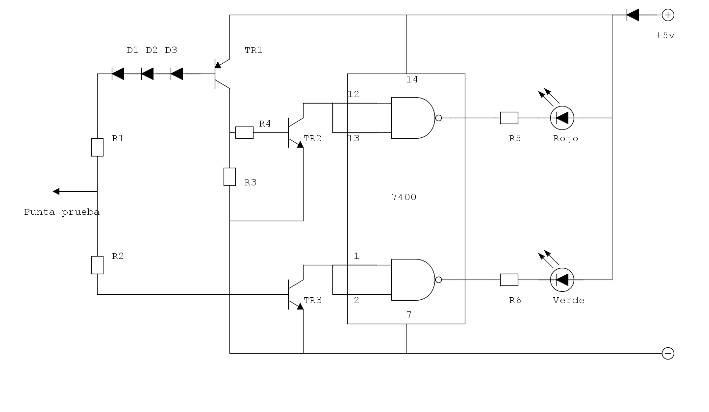 Al “aire” los dos diodos están apagados. El rojo se enciende con nivel lógico de 5 voltios y el verde en nivel lógico bajo. Si el circuito es oscilante, parpadean los dos LED predominando el color según la relación cíclica de la señal. Tener en cuenta que una intensidad de luz inferior a lo normal puede indicar simplemente la presencia de transiciones con una relación cíclica muy pequeña.