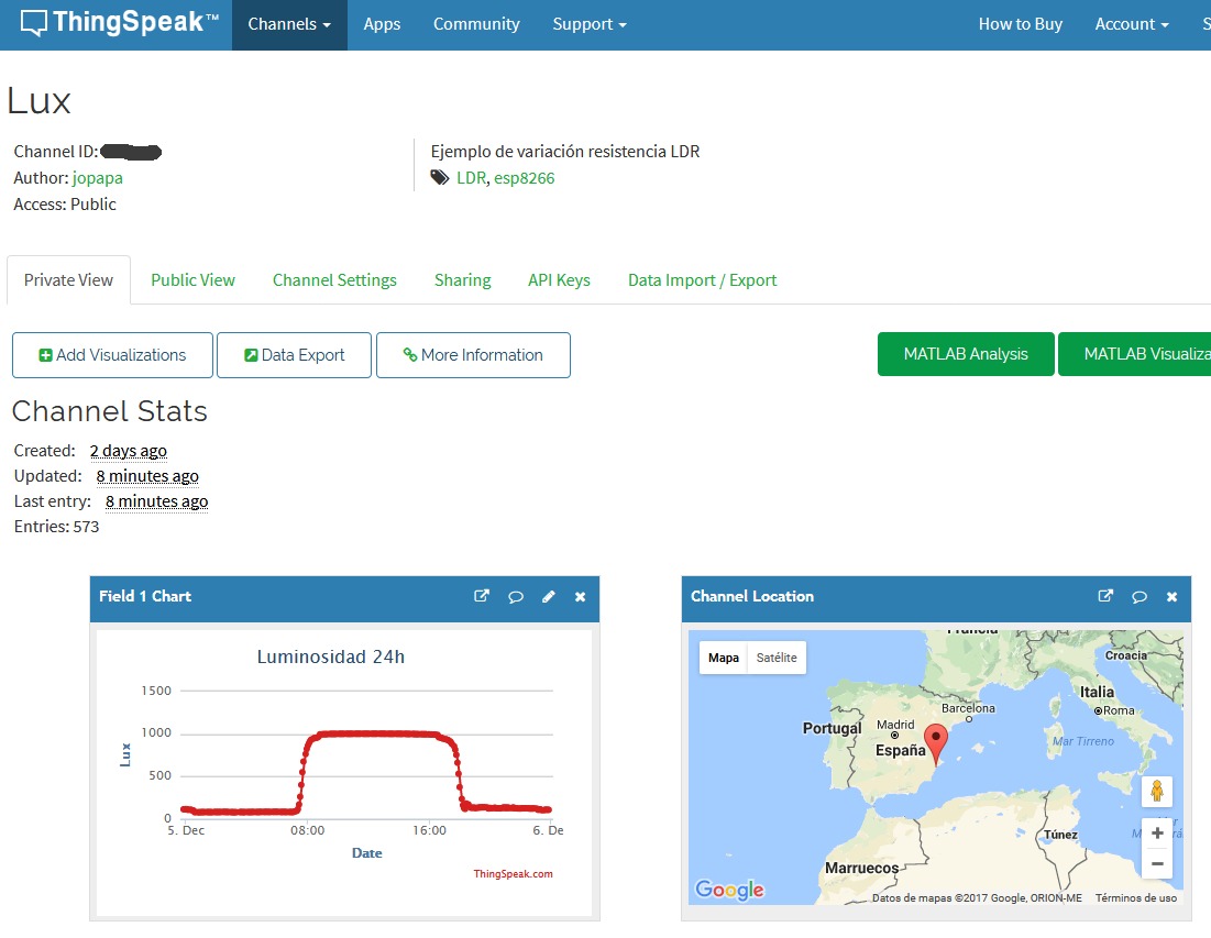Channel ID que nos permitirá accedera a nuestras gráficas desde Internet con el formato: https://thingspeak.com/channels/xxxxxx/private_show
