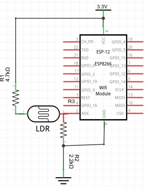 Un divisor resistivo R1 y R2 que garantizan que aún con máxima luminosidad no se sobrepasará 1 voltio en la entrada ADC del esp8266. El LDR hará variar dentro de esos limites el voltaje en esa entrada analógica.