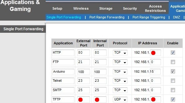 Cada router es diferente. Tenemos que buscar el lugar donde se redirigen los puertos a cada IP interna. En mi router Comtrend está en la opción Virtual Server, ahí decimos que IP vamos a direccionar y que puerto interno y externo a nuestra LAN. En un Linksys esta como Single Port Forwarding